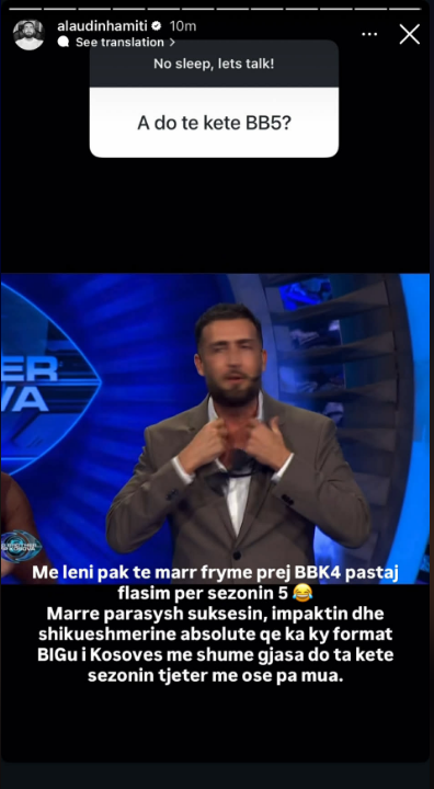 “Me leni pak te marr fryme prej BBK4 pastaj flasim për sezonin 5”, shkroi ai.