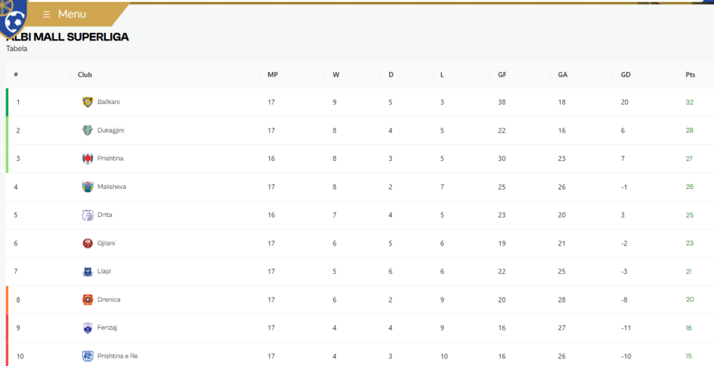 Në dy pozitat e fundit e fundit janë Ferizaji me 16 pikë dhe Prishtina e re me 15 pikë./IndeksOnline/