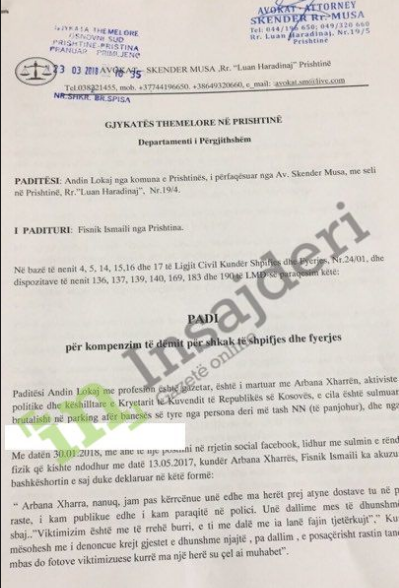 Në padinë e siguruar nga Insajderi, bashkëshorti i këshilltares së kryetarit të Kuvendit të Kosovës, ka paditur Ismailin për shpifje i cili përmes një shkrimi në Facebook, kishte akuzuar Lokajn se kishte sulmuar fizikisht gruan e tij Arbana Xharrën.