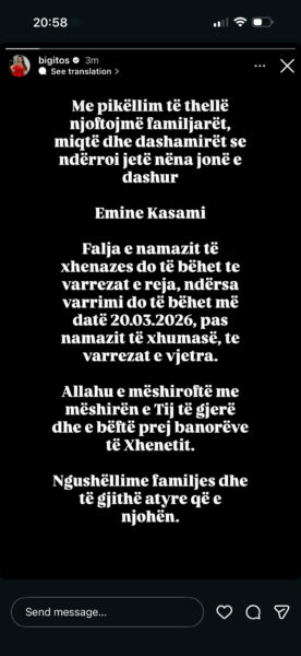 Skenderaj Drenas Mitrovicë Mitrovicë e Veriut Vushtrri Zubin Potok Zveqan BallinaLajmeLajmet e FunditBig Mama njofton vdekjen e nënës së saj March 19, 2026 Big Mama njofton vdekjen e nënës së saj Të ngjajshme Lajme Tronditëse: Viktima në Pestovë është pjesëtar i Policisë së Kosovës Një ngjarje tejet e rëndë ka ndodhur në Pestovë... Lajme “Sot të gjitha janë të shtetit”, VV e kthen një video të fushatës të Kurtit për terminalet Lëvizja Vetëvendosje ka publikuar në facebook një video ku... Lajme Aksident i rëndë në Pestovë, dyshohet për një person të vdekur Një aksident i rëndë raportohet të ketë ndodhur në... Lajme Ambasadori britanik shkon në veri për të takuar Listën Serbe, thotë se ishin konstruktivë për Ligjin për të Huajt Ambasadori i Mbretërisë së Bashkuar në Kosovë, Jonathan Hargreaves,... Sport Fisnik Asllani në radarët e gjigantëve evropianë – “Bild” raporton për interesim nga Bayern Munich, Chelsea dhe Tottenham Sulmuesi i Kosovës, Fisnik Asllani, po vazhdon të tërheqë... Ka vdekur nëna e këngëtares së njohur shqiptare, Big Mama, Emine Kasami. Lajmin e ka bërë të ditur vetë artistja me anë të një postimi të shpërndarë në Instagram. Postimi i plotë: - Advertisement - dphttps://drenicapress.org/ Artikulli paraprakChuck Norris shtrohet në spital Të Fundit Lajme Ligji për të huajt, Kurti e Sveçla s’japin detaje sa dokumente ilegale u “këmbyen” me legale Kuriozitete Meteor misterioz “lëviz” mbi Teksas Automoto Rrezik masiv për miliona iPhone: Malware “DarkSword” kërcënon përdoruesit Lajme Tronditëse: Viktima në Pestovë është pjesëtar i Policisë së Kosovës Sport Automoto Rrezik masiv për miliona iPhone: Malware “DarkSword” kërcënon përdoruesit Sport Fisnik Asllani në radarët e gjigantëve evropianë – “Bild” raporton për interesim nga Bayern Munich, Chelsea dhe Tottenham Sport Ska pushim as për festën e Bajramit, në fundjavë zhvillohet java e 26-të e Superligës së Kosovës, ky është orari Sport Zbutet dënimi për FC Prishtina, ndeshja ndaj Ballkanit luhet me praninë e tifozëve Sport Çfarë goli spektakolar e shënoi Zhegrova në stërvitje, feston krejt ekipi i tij ShowBiz ShowBiz ‘Nuk e di si ju mban toka’: Rozana Radi shpërthen pas lajmit të rremë për vdekjen e saj ShowBiz Shokon aktorja 70-vjeçare: “Dua lidhje veç për një natë” ShowBiz Lori Hoxha shtatzënë? Detaji që e “tradhtoi”