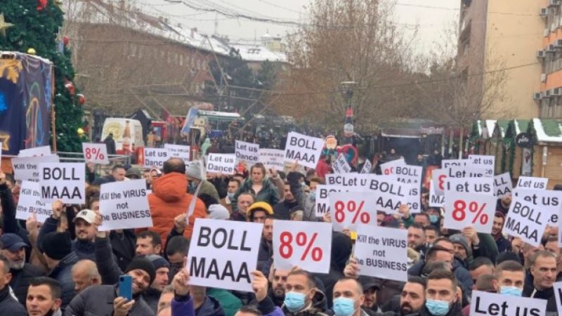 “Boll Ma”, “Vriteni virusin dhe bizneset”, “Le tus Dance” janë disa nga pankartat që përfaqësuesit e bizneseve po mbanin në duar derisa po protestonin para objektit të Qeverisë së Kosovës për t’i kundërshtuar masat antiCOVID-19.
