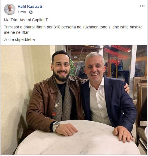 “Trimi sot e dhuroj Iftarin për 310 persona ne kuzhinën tonë si dhe ishte bashkë me ne në Iftar. Zoti e shpërbleftë”, ka shkruar Kastrati në Facebook./kk