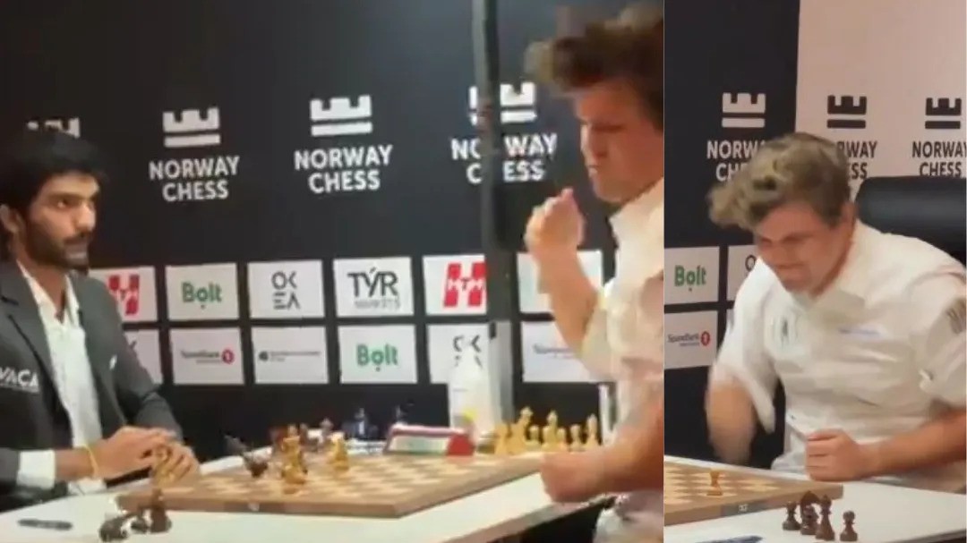 Magnus Carlsen punches the table in frustration after losing to world champion Gukesh Dommaraju for the first time in a classical game at #NorwayChess today. pic.twitter.com/z0fvYuJsY0