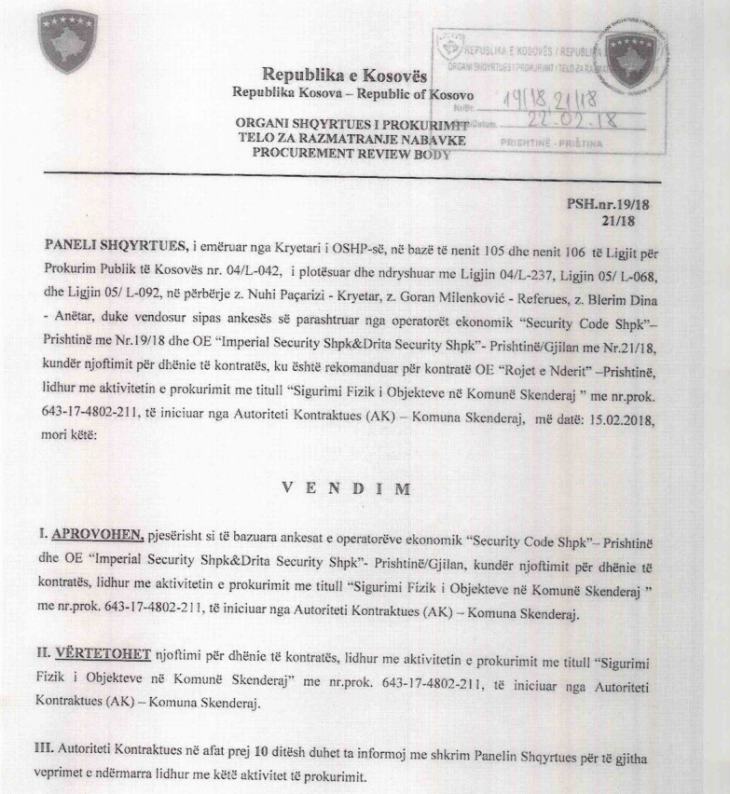 “Aprovohen pjesërisht si të bazuara ankesat e operatorëve ekonomik “Security Code” — Prishtinë dhe OE “Imperial Security Shpk & Drita Security Shpk” kundër njoftimit për dhënie te kontratës”, thuhet në vendimin e OSHP-së.
