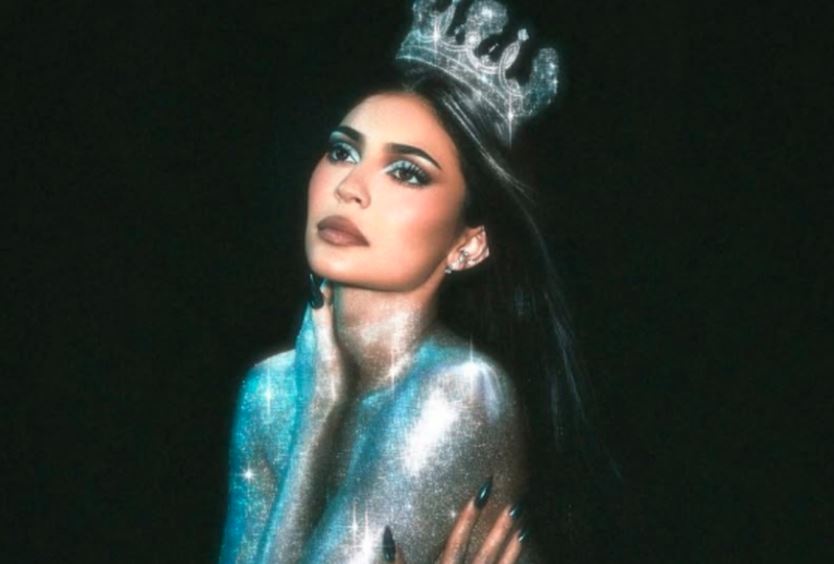 Në fotot që ndau me ndjekësit në Instagram, Jenner shfaqet e zhveshur, “e veshur” vetëm me një shtresë shkëlqimi metalik argjendi dhe një kurorë mbretërore në kokë.