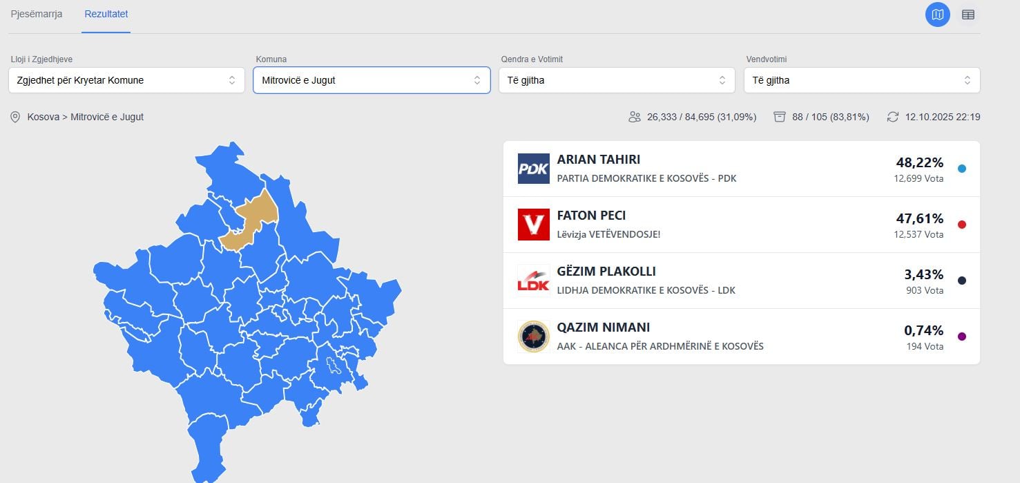 Kandidati i PDK-së, Arian Tahiri është duke fituar momentalisht me 48.22 për qind apo 12 mijë e 699 vota, transmeton lajmi.net.