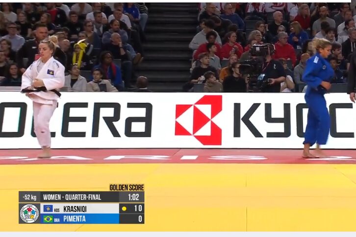 Distria në ndeshjen qerekfinale e mposhti me IPPON xhudisten braziliane, Larissa Pimenta.