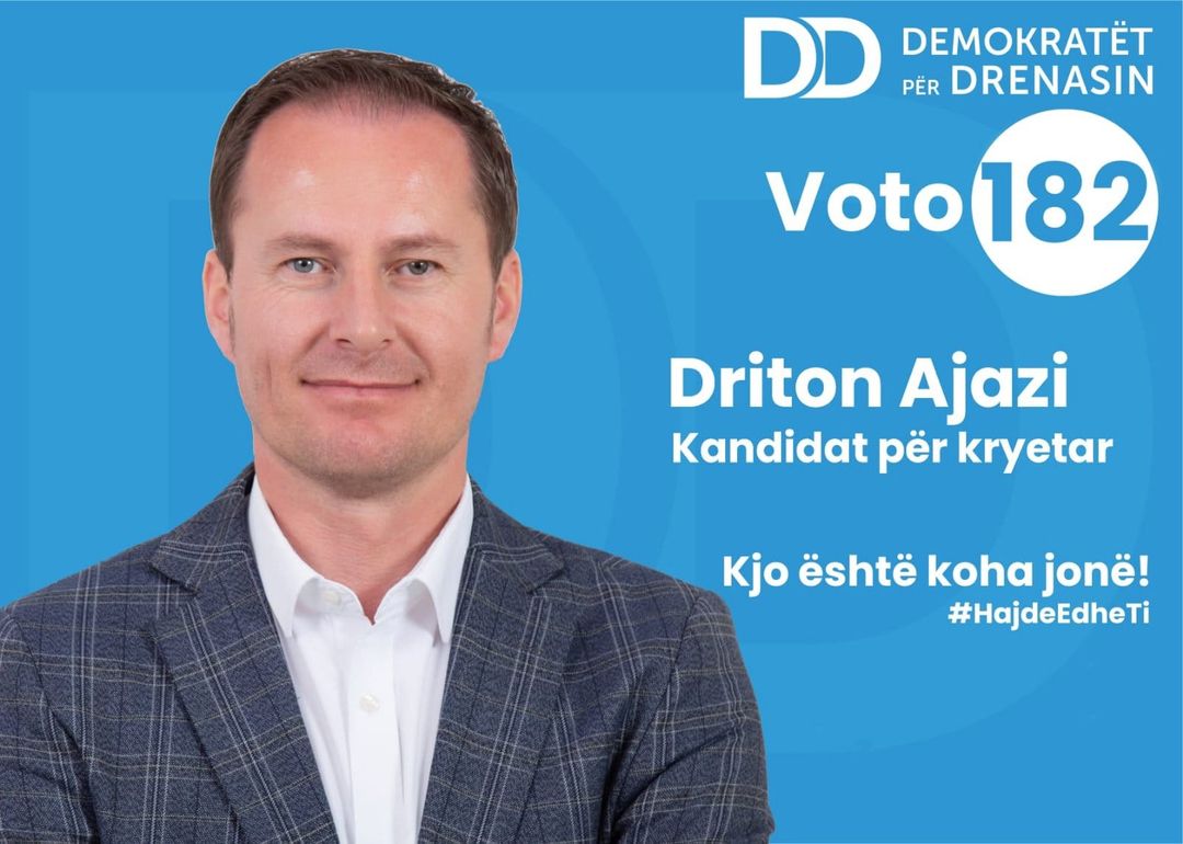 Kandidati për Kryetar të Drenasit, Driton Ajazi nga partia Demokratët për Drenasin. Thotë se anëtarët e vërtetë të PDK-së në Drenas janë përkrahë tij.