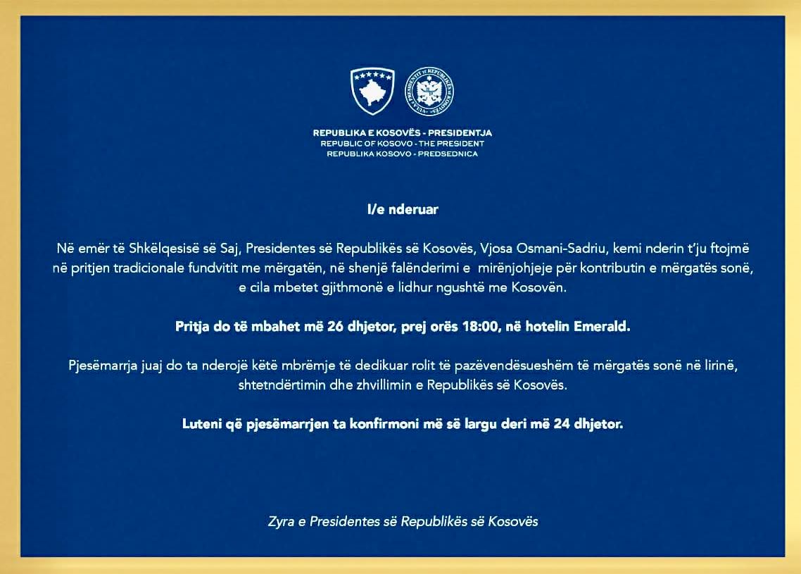 Nga Zyra e Presidentes nuk është dhënë ndonjë sqarim shtesë lidhur me kohën e përzgjedhur për këtë ngjarje, ndërsa të ftuarit janë lutur që pjesëmarrjen ta konfirmojnë deri më 24 dhjetor. /Lajmi.net/