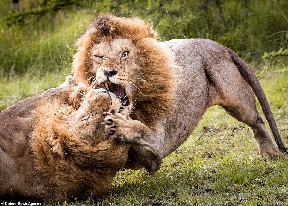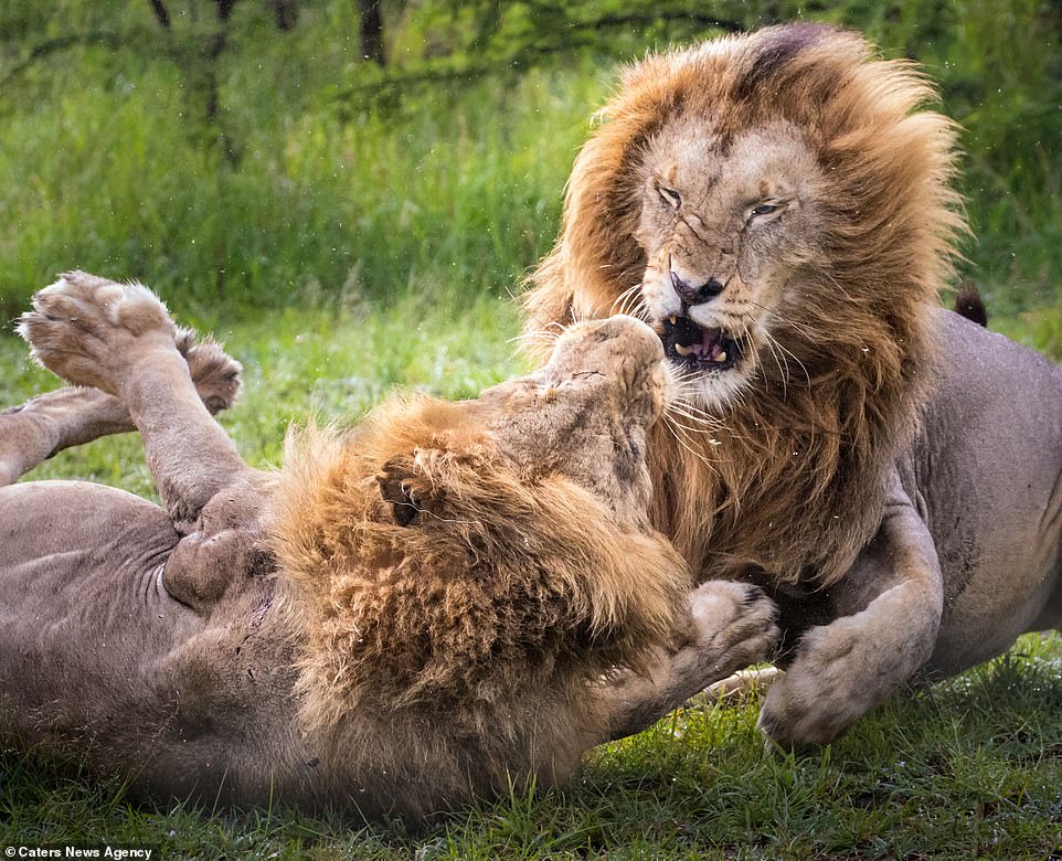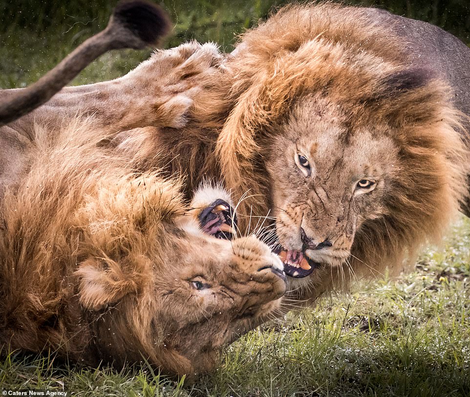 Fotografitë tregojnë momentin dramatik kur dy luanë luftuan dhëmbë për dhëmbë me njëri tjetrin, për një luaneshë. Ngjarja ka ndodhur në Kenia.