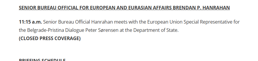 “Zyrtari i Lartë i Byrosë Hanrahan takohet me Përfaqësuesin Special të Bashkimit Evropian për Dialogun Beograd-Prishtinë, Peter Sørensen, në Departamentin e Shtetit”, thuhet në njoftimin e DASH.