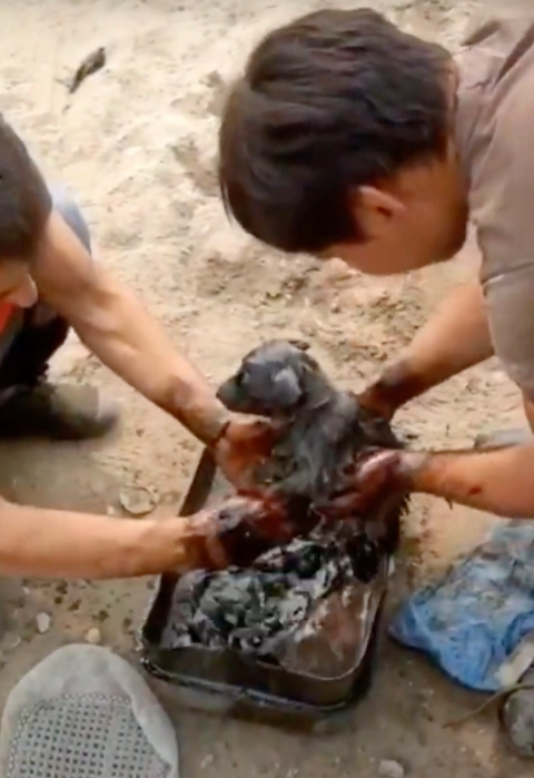 Ajo u tregoi atyre të voglin e saj që kishte ngecur në një gropë katrani. Njëri nga dy vëllezërit Krymkov telefonoi shpëtuesit e kafshëve, derisa në video shihet qenushja e shqetësuar e cila shikon me vëmendje pranë tyre.