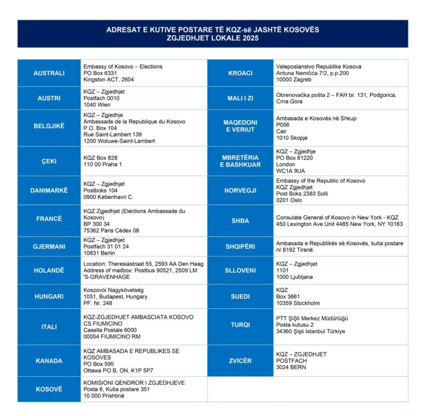 Me qëllim të ofrimit të mundësisë për votim për shtetasit që janë regjistruar për të votuar përmes postës, kutitë postare janë funksionale në këto shtete: Australi, Austri, Belgjikë, Çeki, Danimarkë, Francë, Gjermani, Holandë, Hungari, Itali, Kanada, Kosovë, Kroaci, Mali i Zi, Maqedonia e Veriut, Mbretëria e Bashkuar, Norvegji, SHBA, Shqipëri, Slloveni, Suedi, Turqi dhe Zvicër.