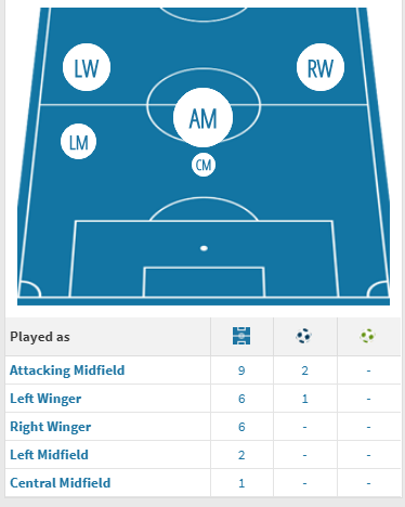 2 ndeshje i ka luajtur si mesfushor i majtë, kurse njëherë është paraqitur edhe në rrolin e mesfushorit defensivë.