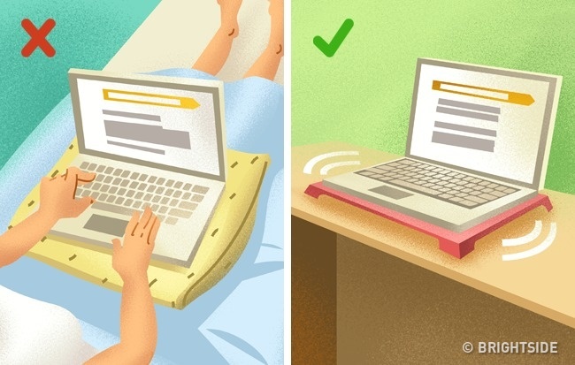 Kur përdorni laptopin, mos e vendosni atë në gjunjë ose në shtrat. Hapjet e ajrosjes së pajisjes duhet të mbeten të paprekura në mënyrë që të evitohet mbinxehja. Zgjidhja ideale është që të përdorni mbajtës special për laptop.