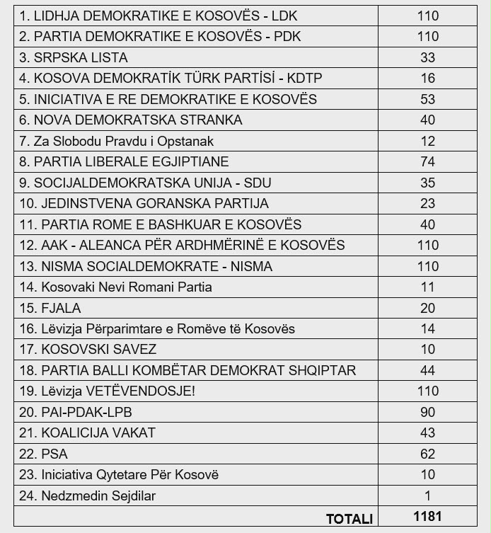 Sipas të dhënave të publikuara, gjithsej 24 subjekte politike kanë dorëzuar listat përkatëse, përfshirë partitë më të mëdha parlamentare dhe përfaqësues të komuniteteve jo–shumicë.