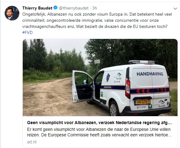 Në një postim në Twitter Thierry Baudet shkruan: “E pabesueshme. Shqiptarët tani edhe në Evropë pa vizë. Kjo do të thotë më shumë krime, emigrim i pakontrolluar, konkurrencë jo e ndershme për shoferët e kamionëve, etj. Çfarë i frymëzon budallenjtë që drejtojnë BE-në? #FVD”.