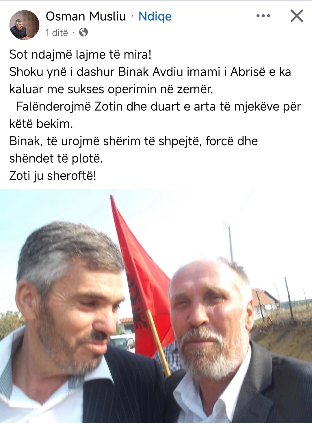 Hoxhë Osman Musliu ka ndarë sot një lajm të gëzueshëm për komunitetin e Abrisë dhe më gjerë. Imami i Abrisë, Binak Avdiu, e ka kaluar me sukses operimin në zemër dhe ndodhet në gjendje të mirë shëndetësore, përcjellë Drenica Press.