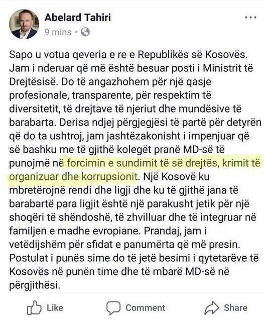 Por ai më tej në një postim në Facebook, ia ka huq duke thënë se së bashku me kolegët e tij do të angazhohet për forcimin e sundimit të së drejtës, krimit të organizuar dhe korrupsionit, transmeton Klan Kosova.