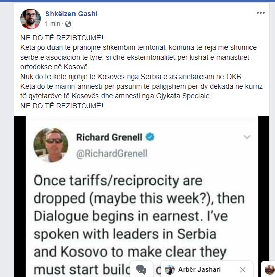 “Këta po duan të pranojnë shkëmbim territorial; komuna të reja me shumicë sërbe e asociacion të tyre; si dhe eksterritorialitet për kishat e manastiret ortodokse në Kosovë. Nuk do të ketë njohje të Kosovës nga Sërbia e as anëtarësim në OKB. Këta do të marrin amnesti për pasurim të paligjshëm për dy dekada në kurriz të qytetarëve të Kosovës dhe amnesti nga Gjykata Speciale. NE DO TË REZISTOJMË!”, ka shkruar Gashi, në një reagim në FB, ku ka bashkëngjitur edhe reagimin e Grenell në twitter.