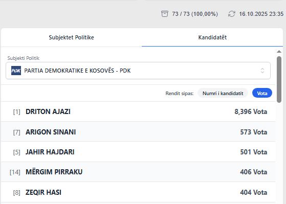 Nga Partia Demokratike e Kosovës, me i votuari ka dal Driton Ajazi me 8 mije e 396 vota, i cili ishte edhe bartës i listës, i ndjekur nga Arigon Sinani me 573 vota, Jahir Hajdari me 501 vota, Mërgim Pirraku me 406 vota dhe Zeqir Hasi me 404 vota.