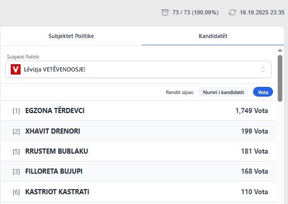 Lëvizja Vetëvendosje është renditur e treta si partia me e votuar në Drenas. Egzona Tërdevci si bartëse e listës ka fituar 1 mijë e 749 vota, e ndjekur nga XHavit Drenori me 199 vota, Filloreta Bujupi me 168 vota, Fortesa Gruda me 98 vota dhe Rrustem Bublaku me 181 vota. /IndeksOnline/