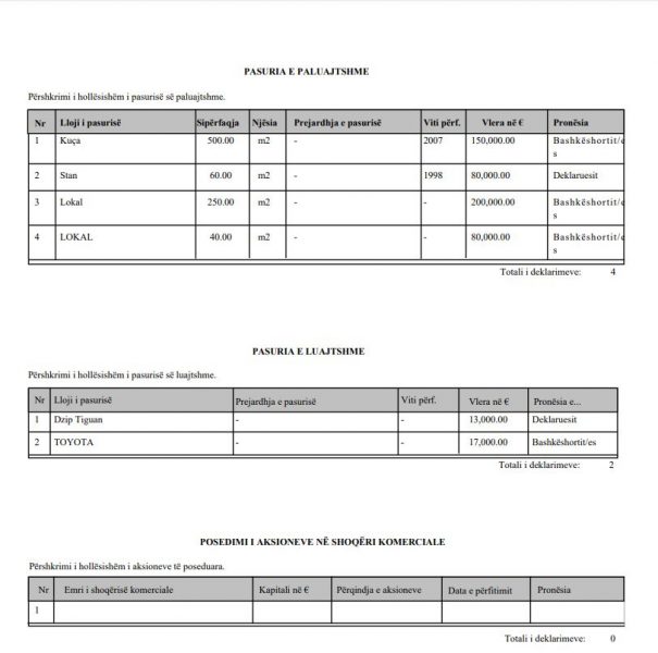 Ndërsa ajo është pronare e një banese në vlerë prej 80 mijë eurosh.