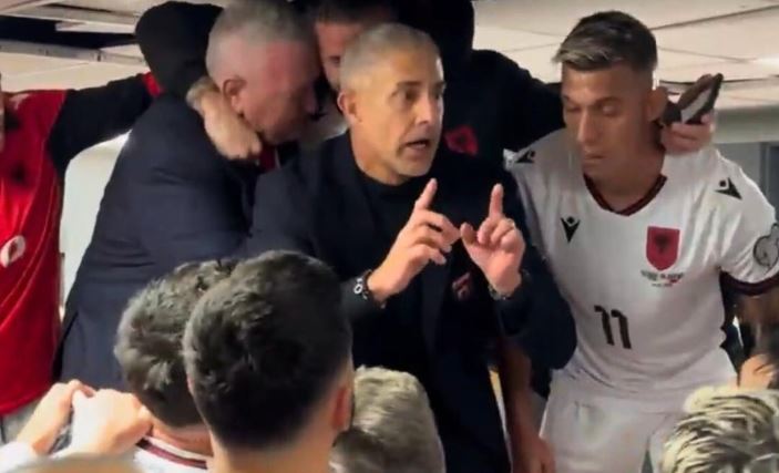 Trajneri Sylvinho hipi mbi tavolinë për t’i thënë disa fjalë, por s’e lejuan lojtarët – pasi aty nisi festa e çmendur.
