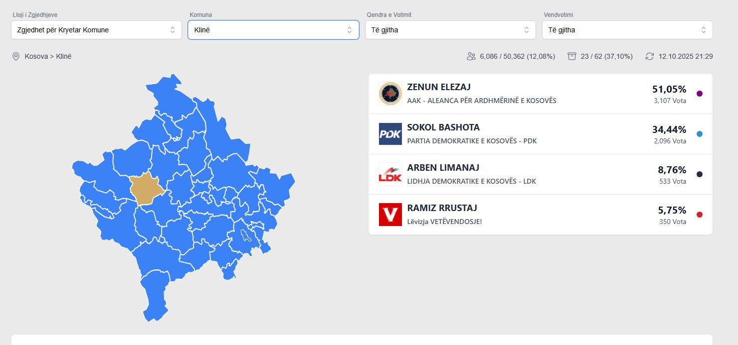 Nga 37.10 për qind të vendvotimeve, Zenun Elezaj i AAK-së ka 51.05 për qind, transmeton lajmi.net.