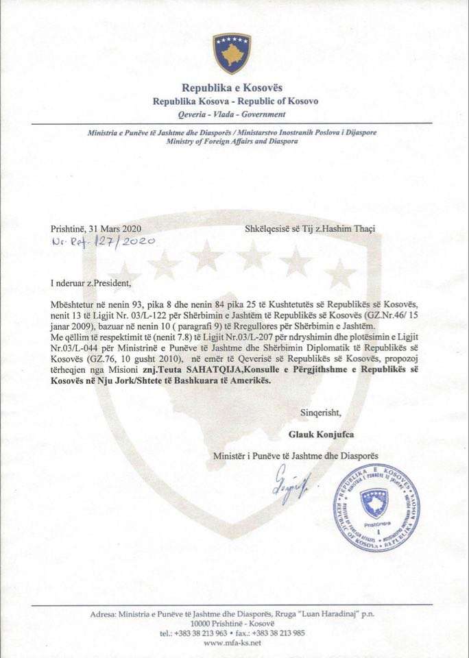 Ministri i Jashtëm në detyrë i Kosovës, Glauk Konjufca, i ka propozuar Presidentit Hashim Thaçi që ta tërheq nga misioni Konsullen e Përgjithshme në New York, Teuta Sahatqija.