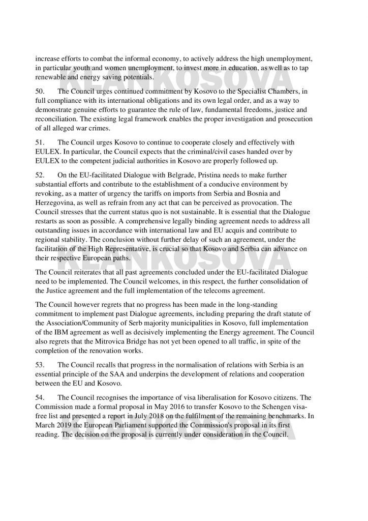 Këto janë dy pjesë kyçe nga Konkluzat e Këshillit të Ministrave të Bashkimit Evropian që do të miratohen në mbledhjen e sotme dhe të cilat Klan Kosova i ka siguruar në tërësinë e tyre.