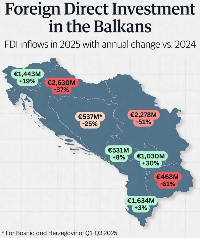 Lëvizjet tregojnë një vit me kontraste të forta në rajon: disa ekonomi po tërheqin më shumë kapital të huaj, ndërsa të tjerat po përballen me rënie të mprehtë të hyrjeve.