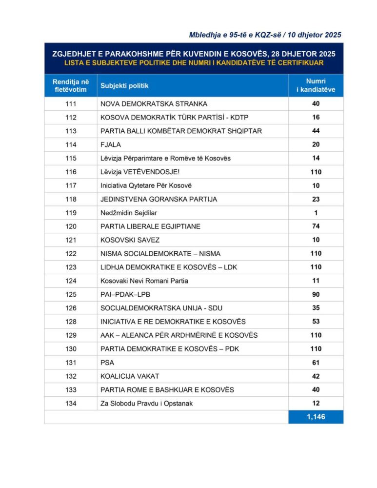 Lista e subjekteve politike dhe numri i kandidatëve të certifikuar në këtë mbledhje (10 dhjetor 2025) është: