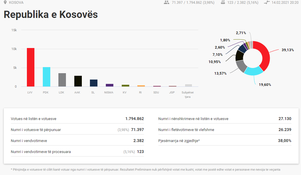 Komisioni Qendror i Zgjedhjeve ka nisur publikimin e rezultateve preliminare në nivel vendi.Në bazë të dhënave që janë publikuar deri më tani, Lëvizja Vetëvendosje prinë me numrin e votave.E dyta është PDK, e trata LDK dhe AAK e katërta.