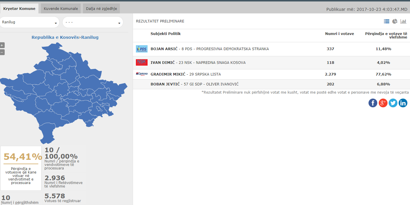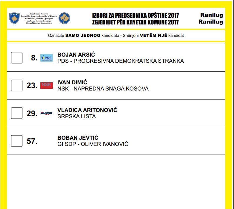 Më poshtë është fletëvotimi i siguruar nga Klan Kosova ku shihet se kandidat për Listën Serbe nuk figuron të jetë kryetari i ndjerë i Ranillugut, Gradimir Mikiq por Vladica Aritonoviq.