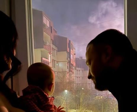 Në pamjen e realizuar nga brenda shtëpisë, familja shihet duke shijuar një moment të qetë, teksa vogëlushi Daskan vështron jashtë dritares, i rrethuar nga përqafimi i prindërve.
