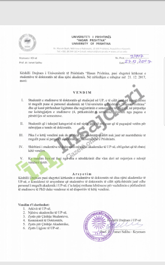 “Studentët e studimeve të doktoratës që studiojnë në UP, e të cilët janë në marrëdhënie të rregullt pune si personel akademik në Universitetin e Prishtinës “Hasan Prishtina” dhe që kanë përfunduar ligjëratat dhe regjistrimin e semestrave të rregullt, në përputhje me kohëzgjatjen e studimeve (4, përkatësisht 6 semestra) lirohen nga pagesa e përsëritjes së semestrave”, thuhet në vendimin që Këshilli Drejtues kishte marrë në fund të vitit të kaluar.