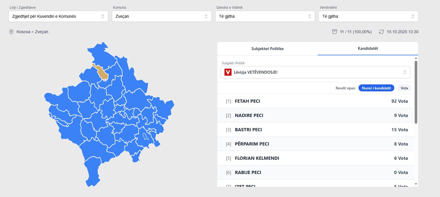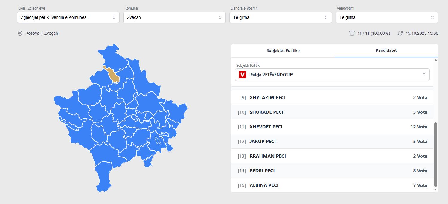 Përveç tij, vetëm dy kandidatë të tjerë nga familja Peci arritën të kalojnë pragun prej 10 votash – Bastri Peci me 15 vota dhe Xhevdet Peci me 12. Ndërkohë, dy nga kandidatët e tjerë të listës nuk morën asnjë votë, sipas të dhënave të publikuara nga Komisioni Qendror i Zgjedhjeve.