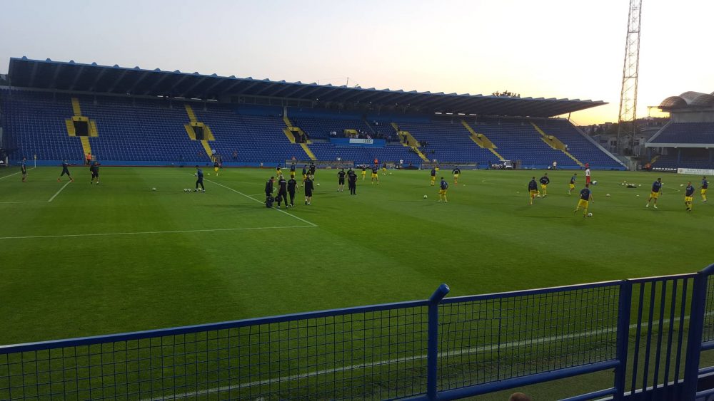 Lojtarët e Kosovës kanë zbritur në fushën e stadiumit të qytetit në Podgoricë, për t’u nxehur para ndeshjes kualifikuese për Kampionat Evropian kundër Malit të Zi.