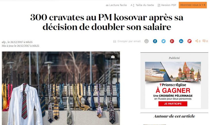 Mediumi francez La Croix se “300 kravata i janë dorëzuar kryeministrit të Kosovës pas vendimit për të dyfishuar pagën e vet”.