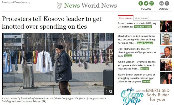 Ndërkaq, mediumi irlandez Independent.ie, ka shkruar se qindra kravata i janë dorëzuar sot kryeministrit të Kosovës, para objektit të qeverisë në Prishtinë./DRENICA PRESS/
