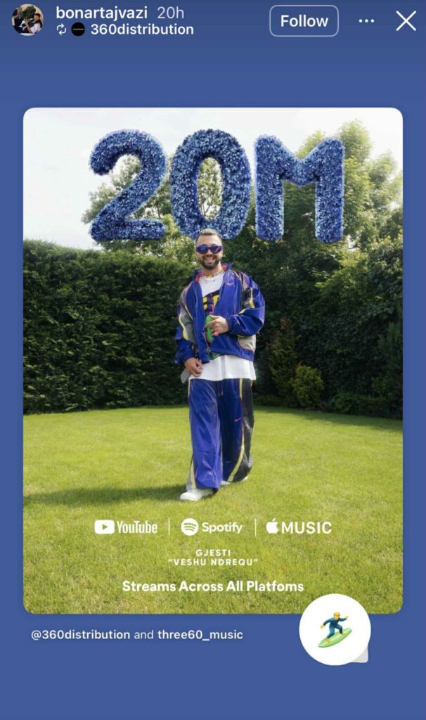 Këtë herë, Bonarti njoftoi se projekti muzikor i Gjestit, “Veshu ndrequ”, ka arritur plot 20 milionë klikime, një sukses i madh për artistin pejan, transmeton IndeksOnline.