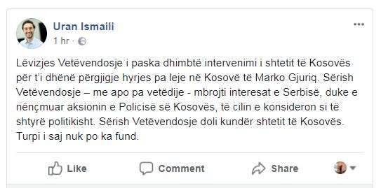 “Lëvizjes Vetëvendosje i paska dhimbtë intervenimi i shtetit të Kosovës për t’i dhënë përgjigje hyrjes pa leje në Kosovë të Marko Gjuriq”.