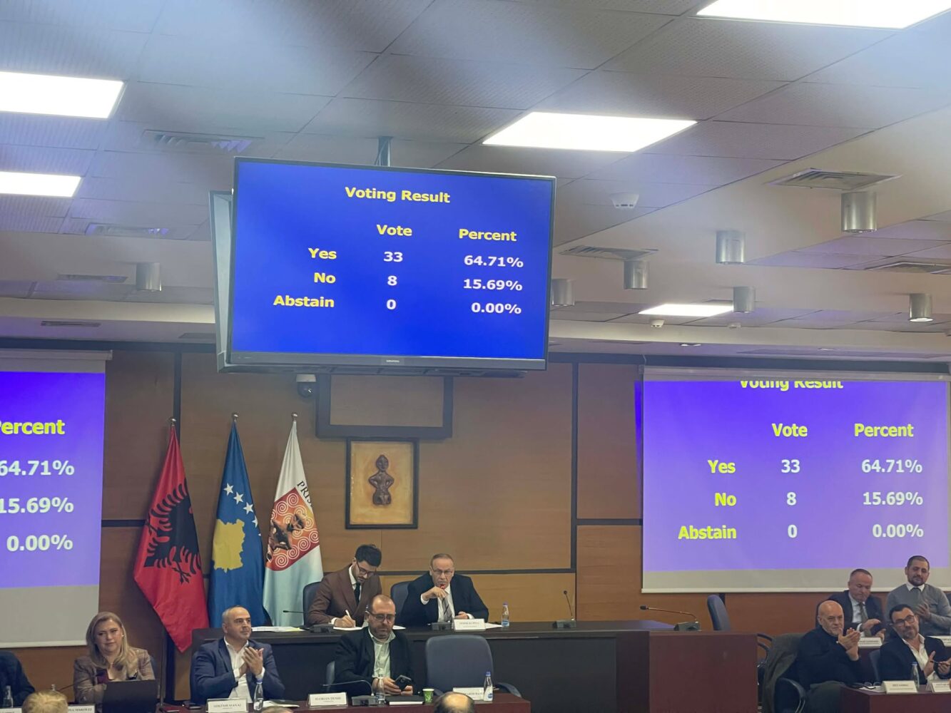 Buxheti kaloi me 33 vota për, tetë kundër dhe asnjë abstenim. Ndërkaq, Lëvizja Vetëvendosje para se të hidhej në votim deklaroi se nuk do ta votonte buxhetin.