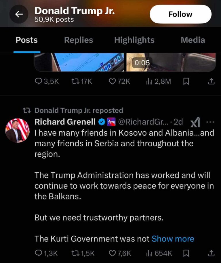 Deklarata e të dërguarit të SHBA’së për Misione të Posaçme, Richard Grenell, ku tha se , ‘mos u mashtroni nga Kurti se është i afërt me SHBA’të’, u shpërnda sot edhe nga djali i Presidentit amerikan Donald Trump.