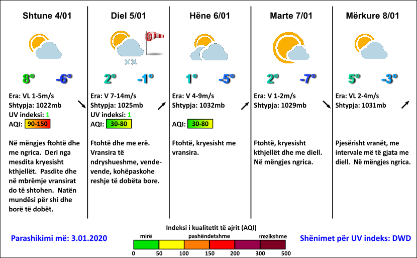 7.01-8.01 – Ditën e martë, kryesisht kthjellët dhe me diell. Në mëngjes ngrica. Të mërkurën, pjesërisht vranët, me intervale më të gjata me diell. Orëve të mëngjesit ngrica.