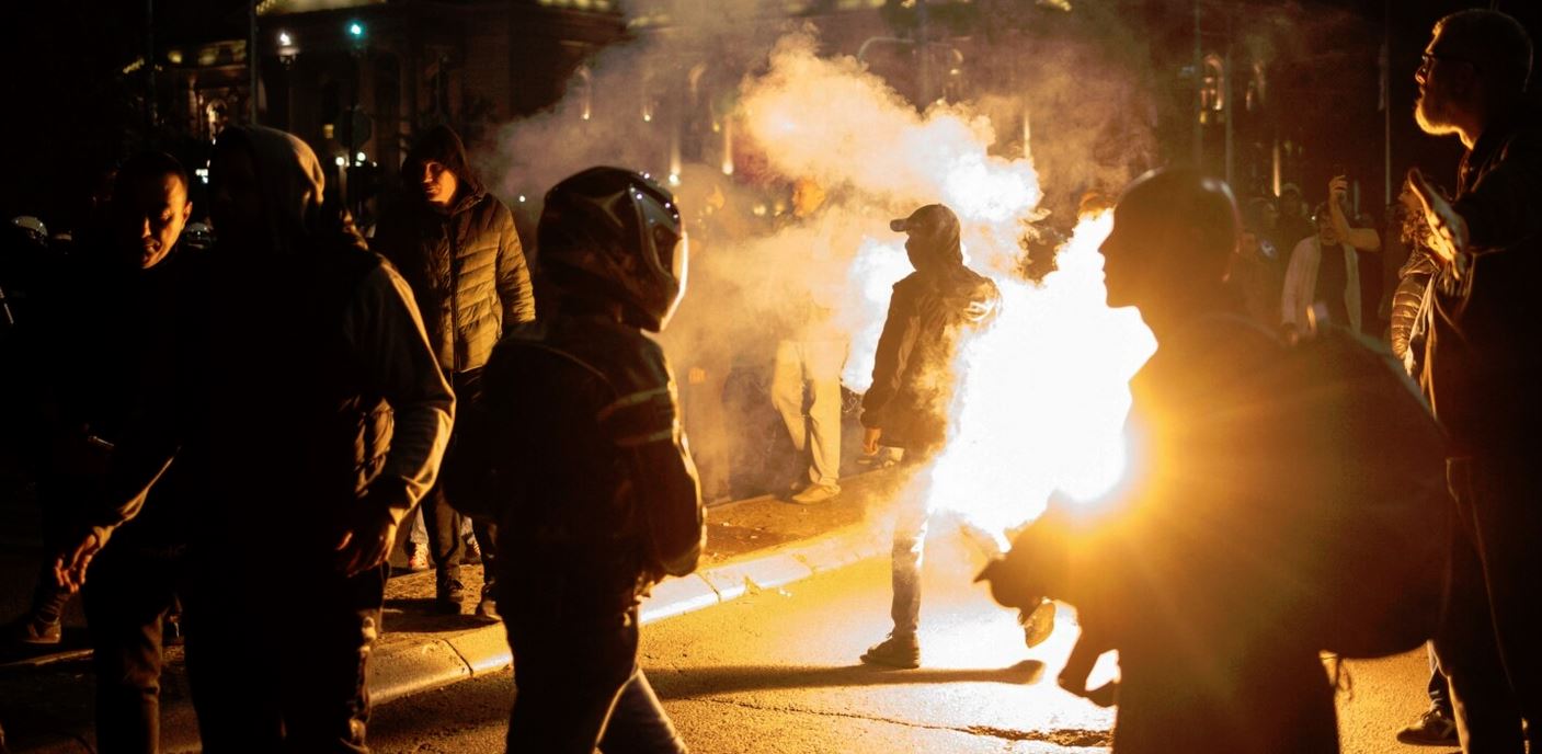 Dita e parë e protestës së saj u zhvillua në atmosferë tensioni. Mes dy palëve fluturonin shishe, pjesë të gardhit metalik dhe mjete piroteknike, ndërsa nga “Qacilandi” dëgjoheshin këngë nacionaliste. Në atë anë ndodhej edhe Novkoviqi.