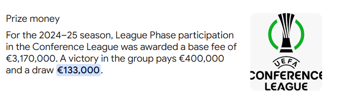 Barazimet në UEFA Conference League kanë vlerën e 133 mijë eurove, kurse fitoret 400 mijë euro.