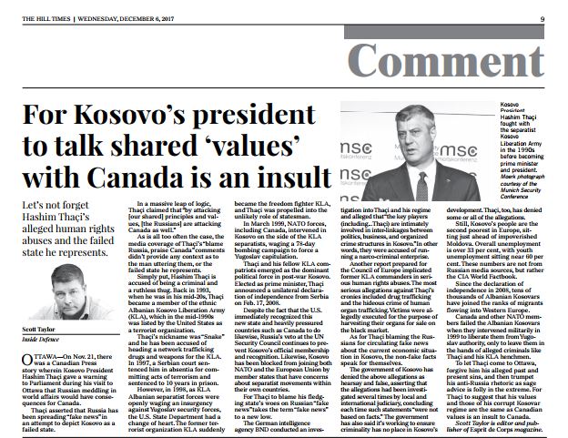 Në një editorial të shkruar nga redaktori i revistës “Esprit De Corps“, Scott Taylor, të publikuar në gazetën kanadeze “The Hill Times“, theksohej se “Hashim Thaçi është i akuzuar për kriminel dhe bandit”, teksa autori reagonte ndaj komenteve të Thaçit ku akuzonte Rusinë për “lajme të rrejshme dhe sulm” ndaj Kanadasë.