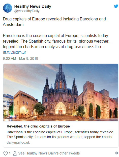 Barcelona është në listën e qyteteve të cilët më së shumti e përdorin kokainën, e përcjellin Cyrihu, Bristoli, Antverpen, Sen Galen dhe Gjeneva.